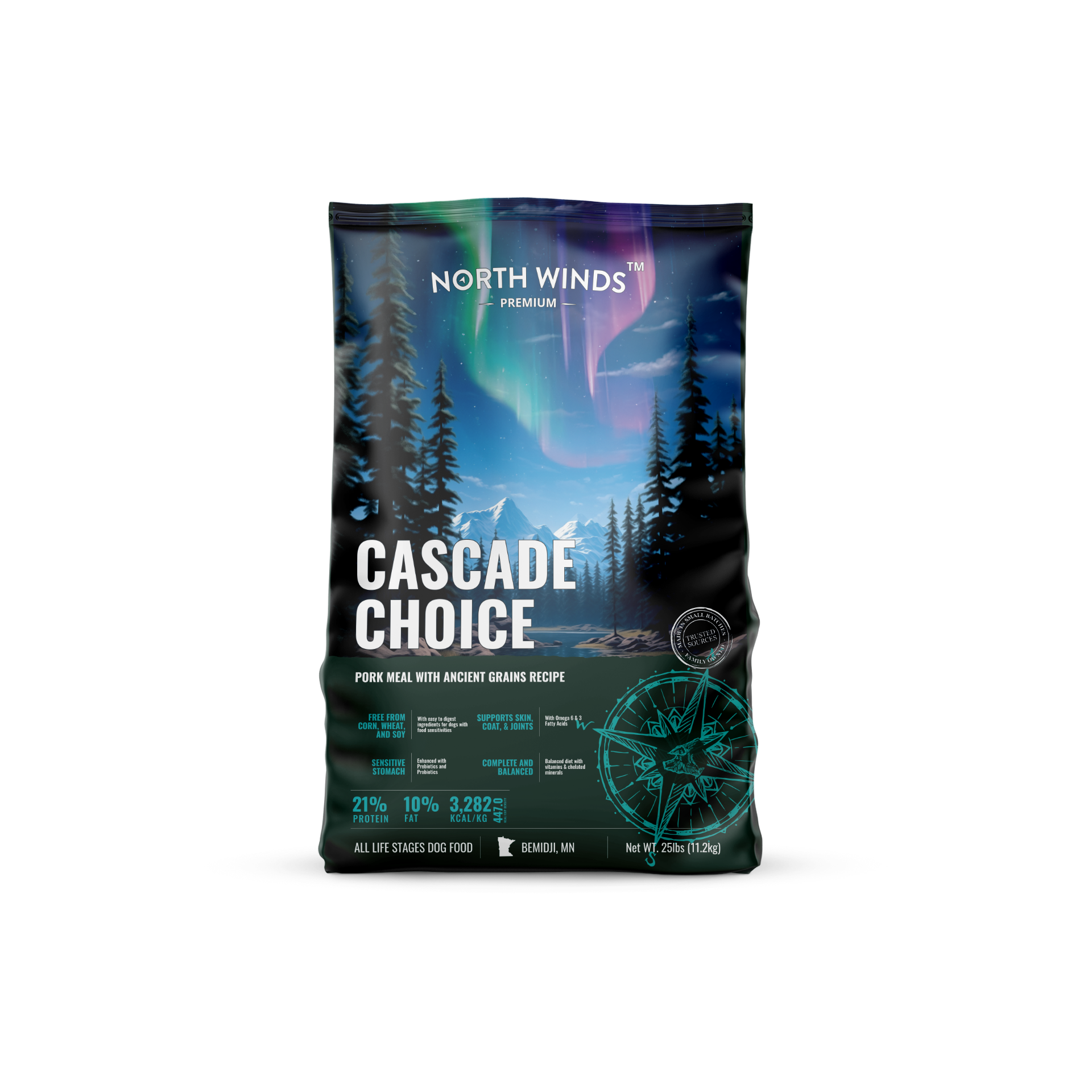 Cascade Choice from North Winds Premium features pork meal and fish meal with ancient grains to create a meat-dense, easy-to-digest diet for dogs of all life stages (excluding large breed puppies). Small-batch cooking helps preserve nutrients while added probiotics, prebiotics, and antioxidants support digestion, skin, coat, and immune health.